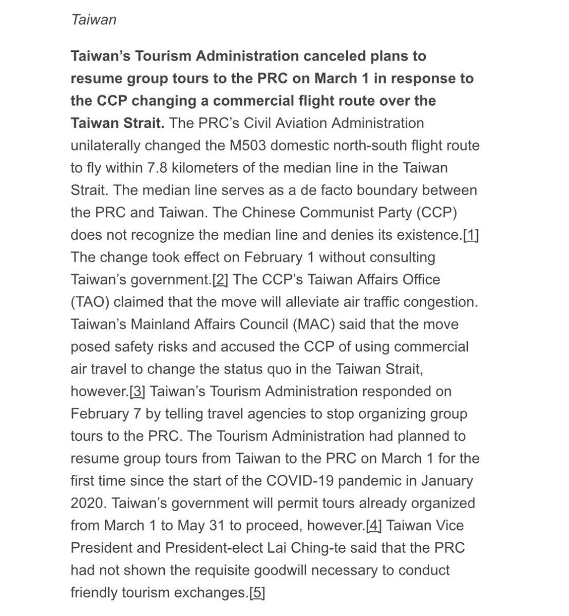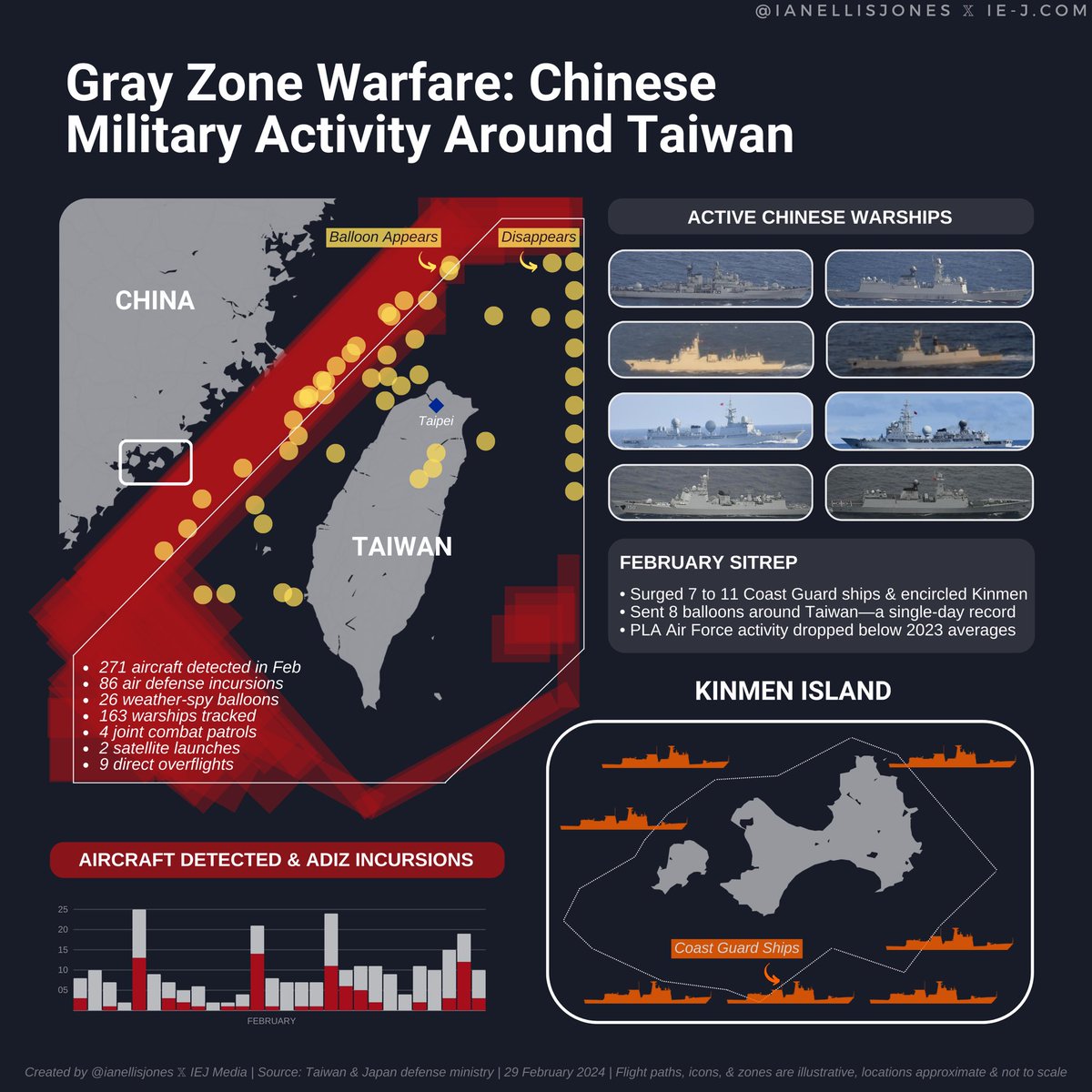 “The PRC uses such tactics in tandem with near-daily air & naval violations of Taiwan’s ADIZ, Chinese Coast Guard patrols near Kinmen & Matsu, adjustment of civilian flight routes to fly closer to Taiwan, & balloon flights through Taiwan’s airspace to wear down Taiwan’s threat awareness & resources, forcing it to be selective in which perceived incursions it chooses to respond to.