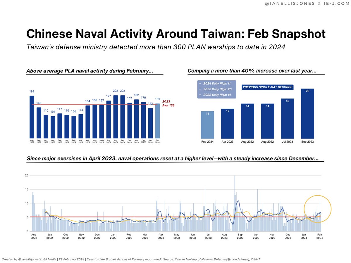 PLA naval activity is a different story. The 305 warships monitored by Taiwan's defense ministry to date in 2024 represent a 40% increase over last year.
