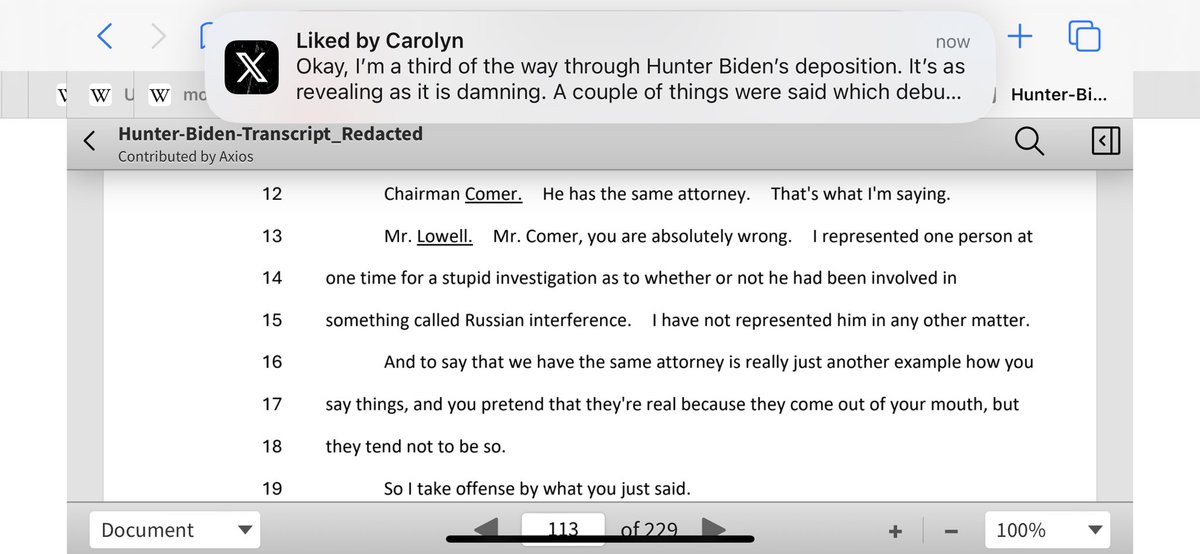 Okay, I’m a third of the way through Hunter Biden’s deposition. It’s as revealing as it is damning. A couple of things were said which debunk a lot of GOP talking points.