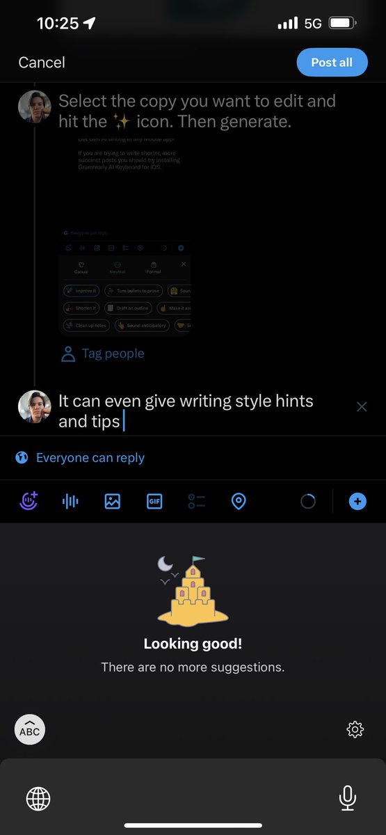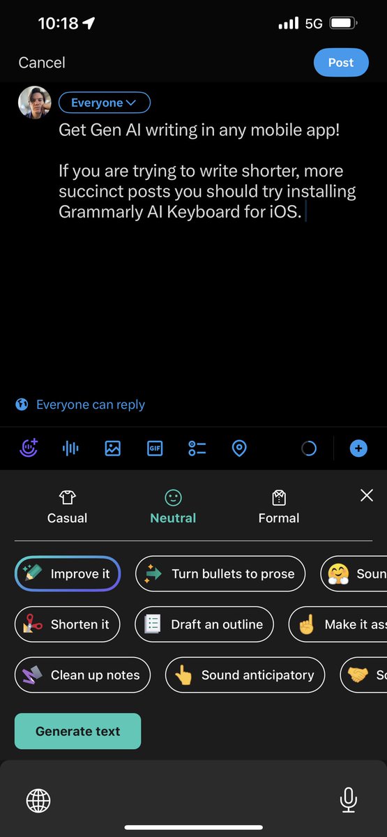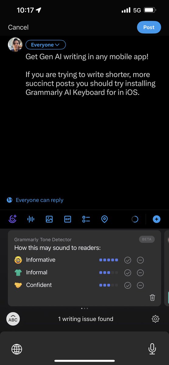 If you struggle with writing concisely, try the Grammarly AI Keyboard for iOS to make your posts shorter and more effective.