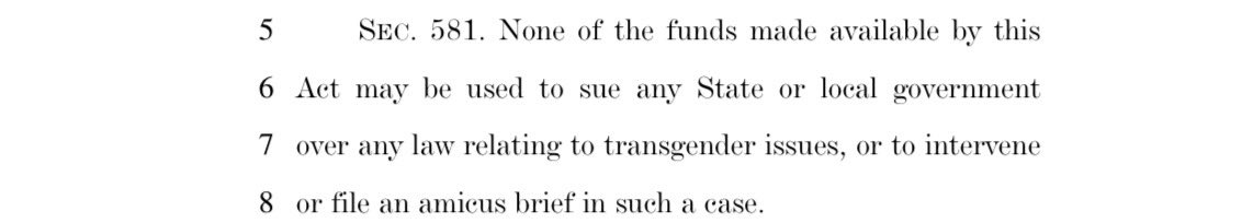 ❌ Surrendered: Prohibiting funds from being used to sue state or local governments over transgender issues.