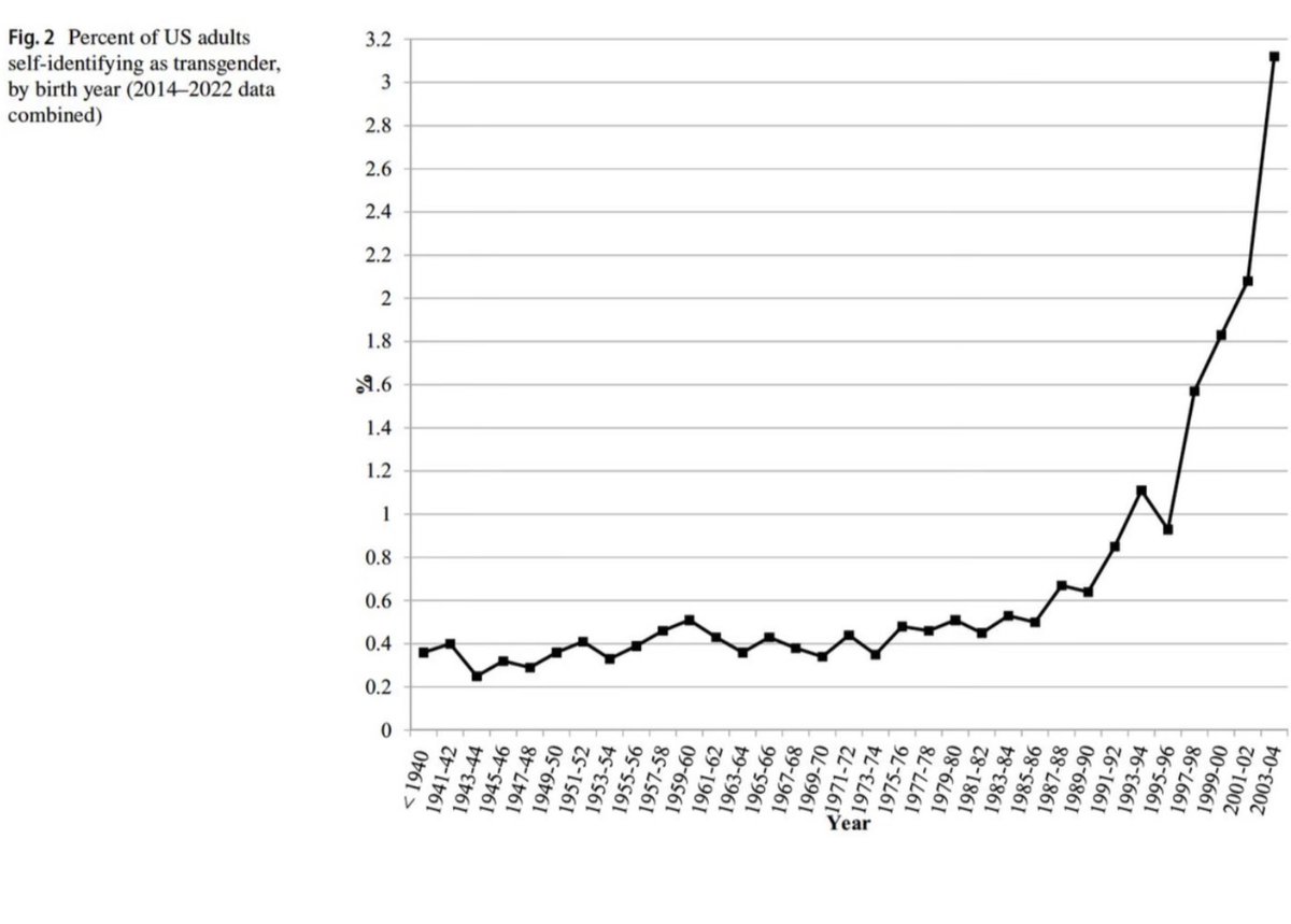 @jean_twenge @epkaufm This 2024 paper found an exponential increase in trans identity with younger Americans. But the data that @jean_twenge found indicates that this graph represented the peak at the youngest end. With successive years, the rate declined. link.springer.com/article/10.100…