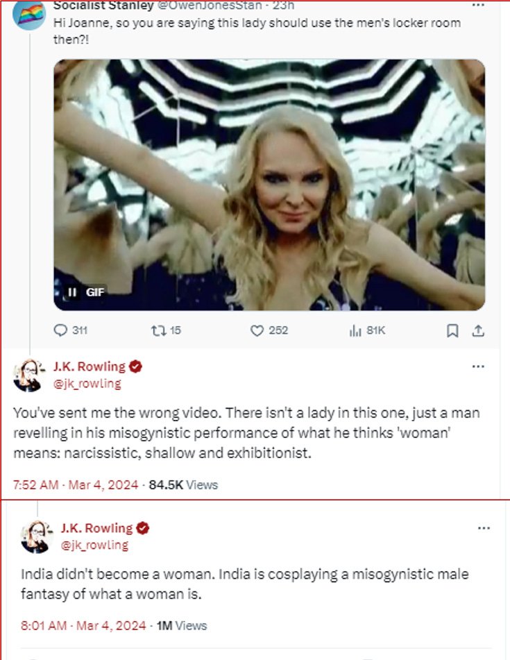 3. Rowling stated that Willoughby is "a man reveling in his misogynistic performance of what he thinks a 'woman means" and then added that India is "cosplaying a misogynistic male fantasy," a claim that stems from the notion that transgender people are "fetishists."