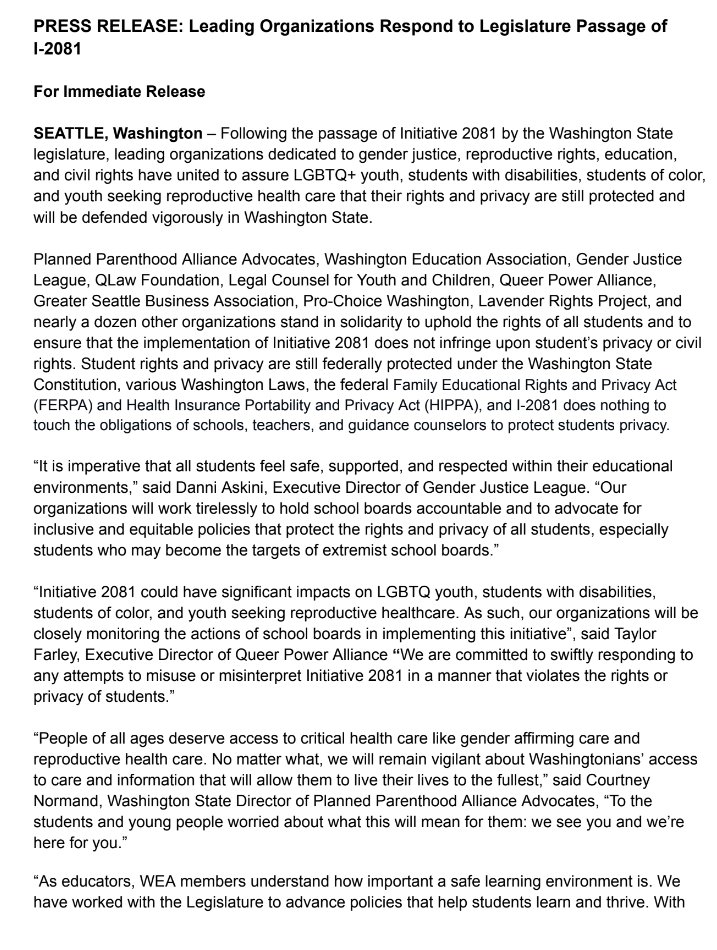 Democratic Speaker Laurie Jenkins and Senator Jamie Pedersen, anticipating blowback, wrote a "why we are passing this" story where they state that they "do not believe it poses a threat to LGBTQ+ youth" but "will watch closely"