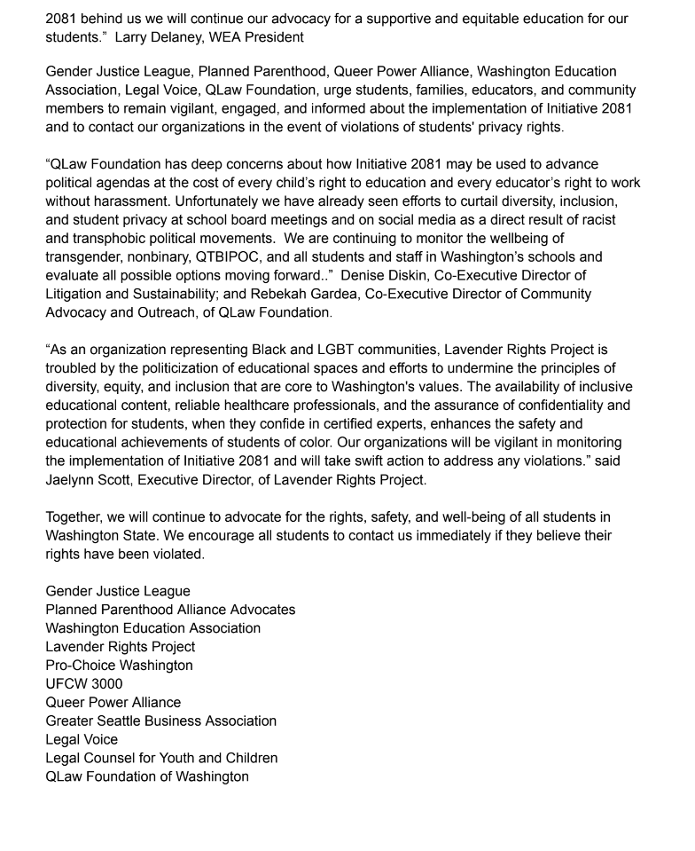 "Initiative 2081 could have significant impacts on LGBTQ youth... Our organizations will be closely monitoring the actions of school boards"