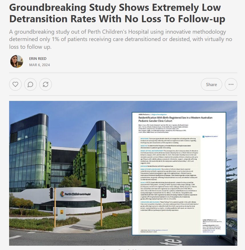 1. A groundbreaking new study shows extremely low detransition or desistance rates among trans youth from 2014-2022. It uses an innovative methodology resulting in almost NO "loss to follow up."