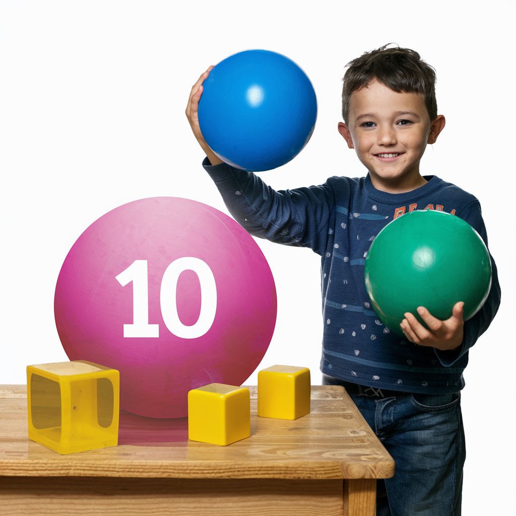 A photo of a boy holding a blue ball in his right hand, and a green ball in his left. Beside him is a wooden table, with a large pink ball and three smaller yellow cubes. The pink ball should have the number "10" on it.