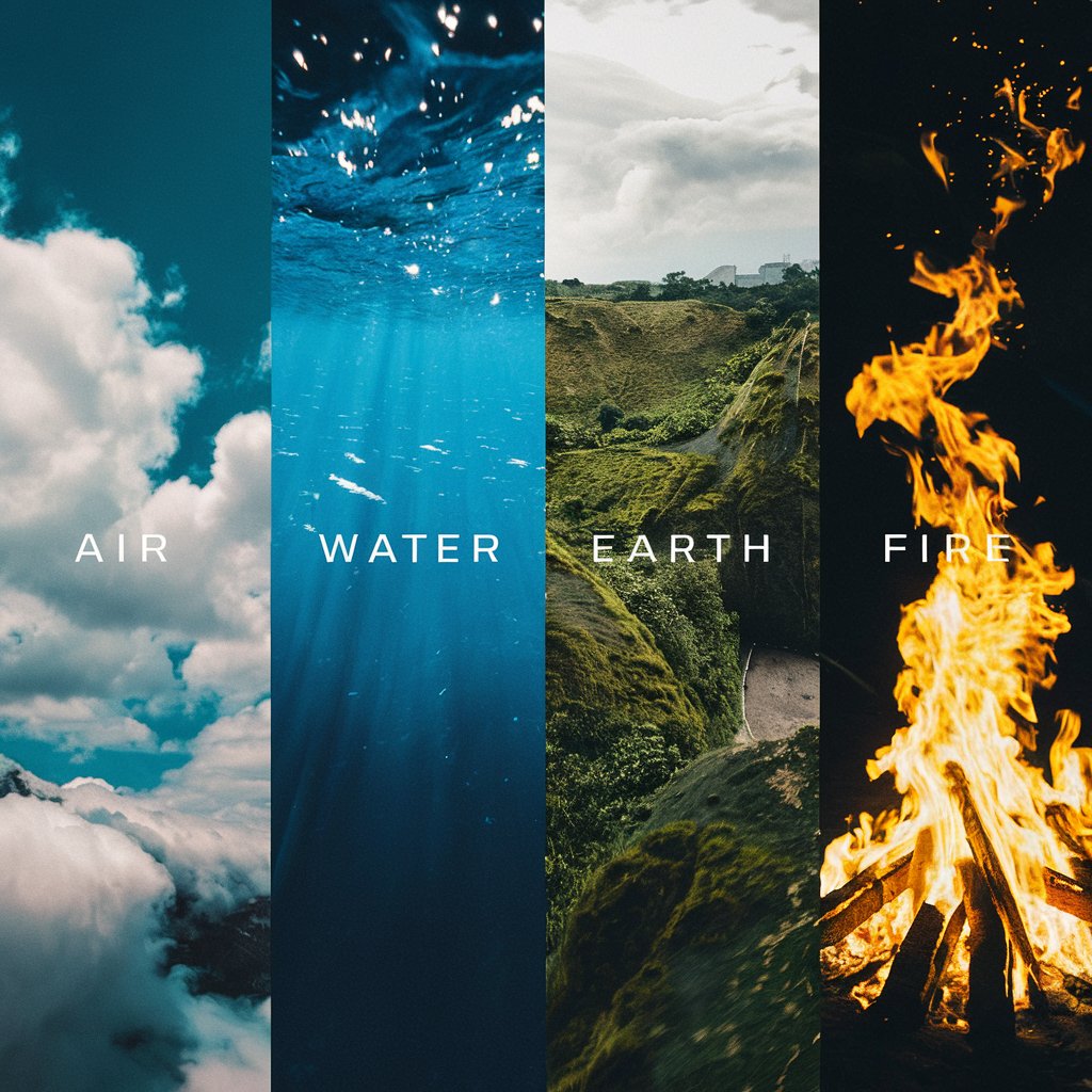 A cinematic montage showcasing the four elements: "Air" with a breezy sky filled with floating clouds, "Water" depicting a deep, serene ocean, "Earth" capturing a lush, green landscape, and "Fire" illustrating a dynamic, crackling bonfire, each embodying the essence and power of its respective element.