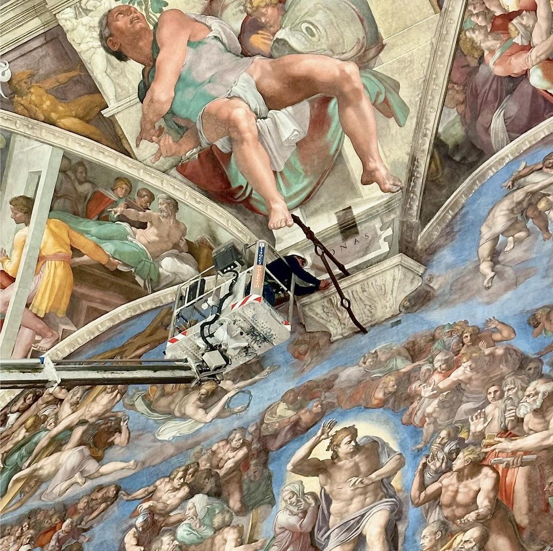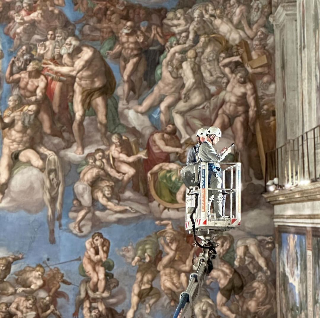 To protect the artwork from damage caused by large crowds of visitors, the team cleans the frescoes and removes contaminants using a crane-like machine nicknamed "Spider", a Multitel SMX250 self-propelled tracked platform.