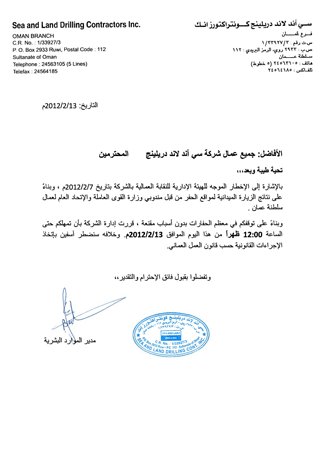 في أيّار 2012 اتفق عمال قطاع النفط على إضراب عام بسبب تجاهل شركاتهم لمطالبهم واتفقوا على يوم مشترك لبداية الإضراب نهاية الشهر فتأذى قطاع النفط لعدة أيام قبل أن تطلب السلطات من الشركات تنفيذ أغلب المطالب لينتهي الإضراب.وكان مترافقاً مع حركة شعبية واسعة لتأميم قطاع النفط العماني.