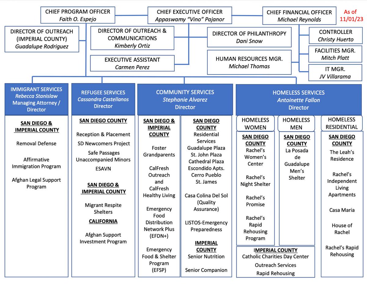 Here is the organizational chart of the Catholic Charities Diocese of San Diego as of Nov. 1, 2023. Included is Cassandra Castellanos who is the Refugees Service Director we mentioned live "On The Inside."