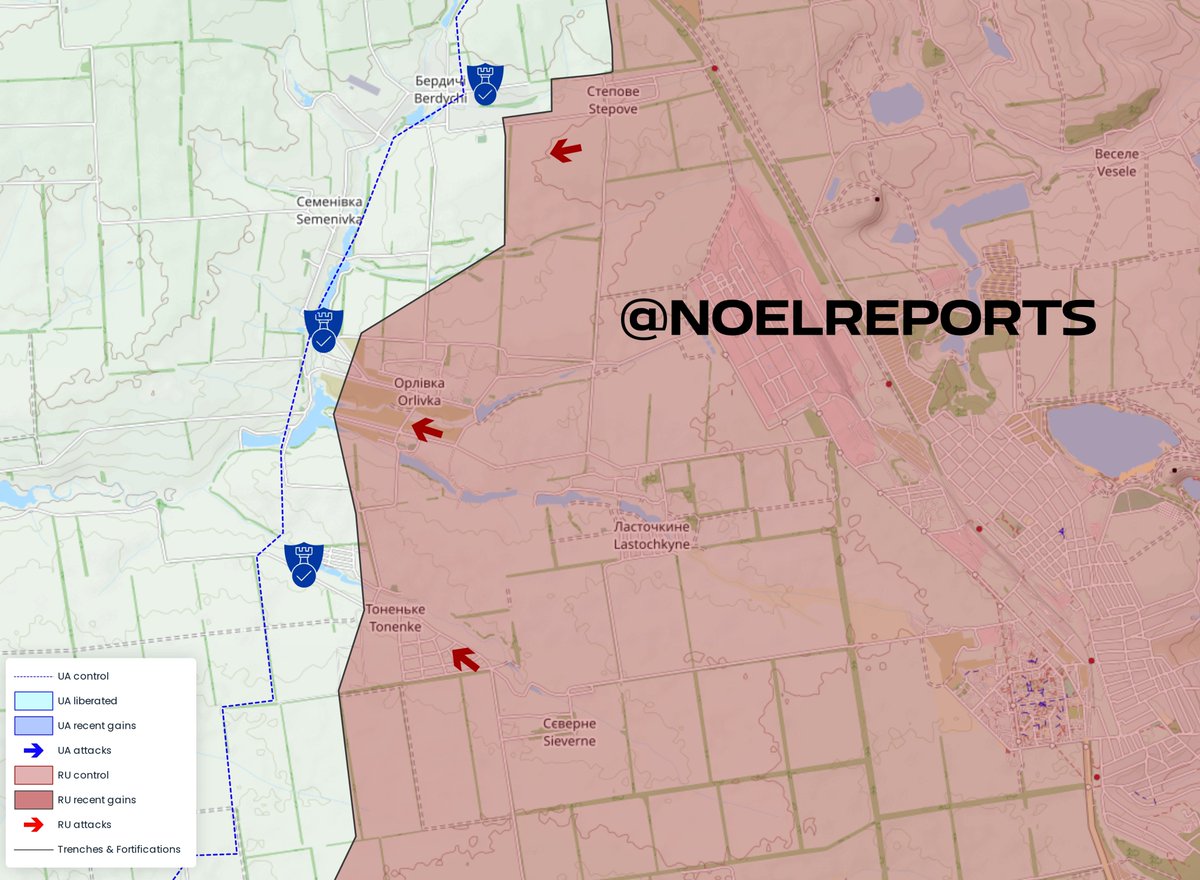 It appears that Ukraine has managed to dig in on the western borders of Berdychi, Orlivka and Tonen'ke and secure a temporary, strong defense line. Russia attacks are reported to a lesser extent and what is carried out is countered by defence forces.
