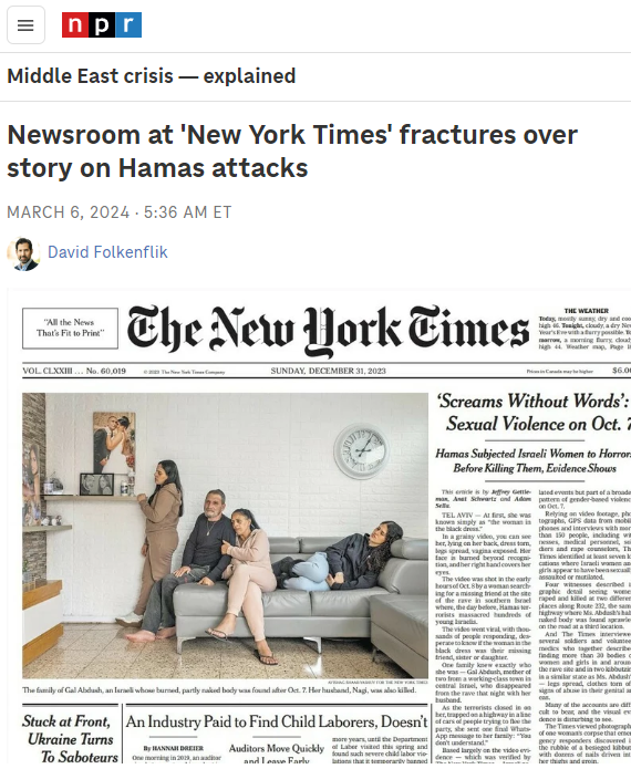 the scandal over the New York Times' "mass rape" hoax, self-admittedly fabricated by Jeffrey Gettleman, Adam Sella and Anat Schwartz "because it is important for Israeli hasbara [propaganda]", is spreading to mainstream media. NPR has just done a report on it