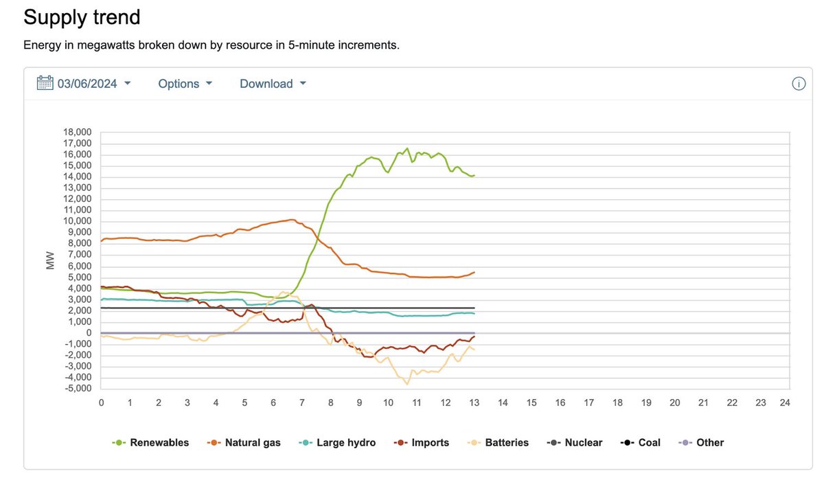 The grid almost always has some fossil fuel resource that’s producing and that will be displaced by a new solar project. Here’s the supply curve from this week, March 6, in California. Solar ramps up, gas ramps down. caiso.com/todaysoutlook/…