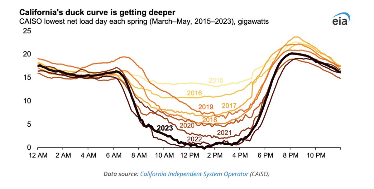 3a. Notably, the expensive evening peak demand is also falling in California, in part due to solar-charged batteries dispatching in the evening hours.