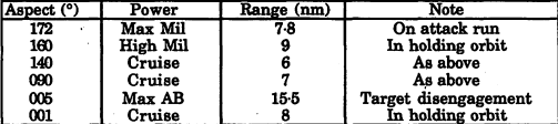 You'll notice in this chart the significant differences between lock ranges on cruise power versus afterburner power, and this was at high altitudes! Bombers would also likely not put out as much heat as an F-16, and therefore a more faint IR signature (180° appears to be front).