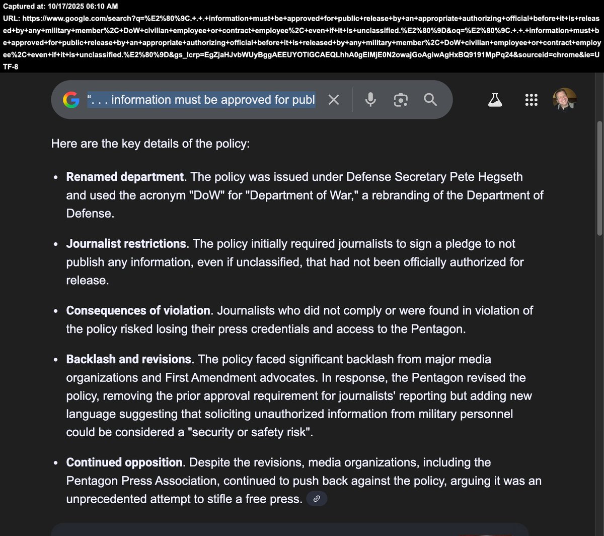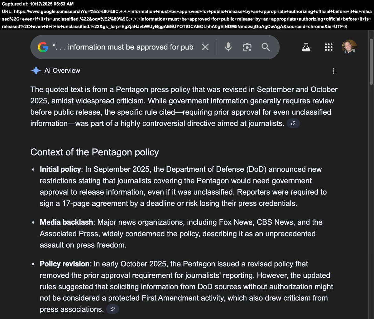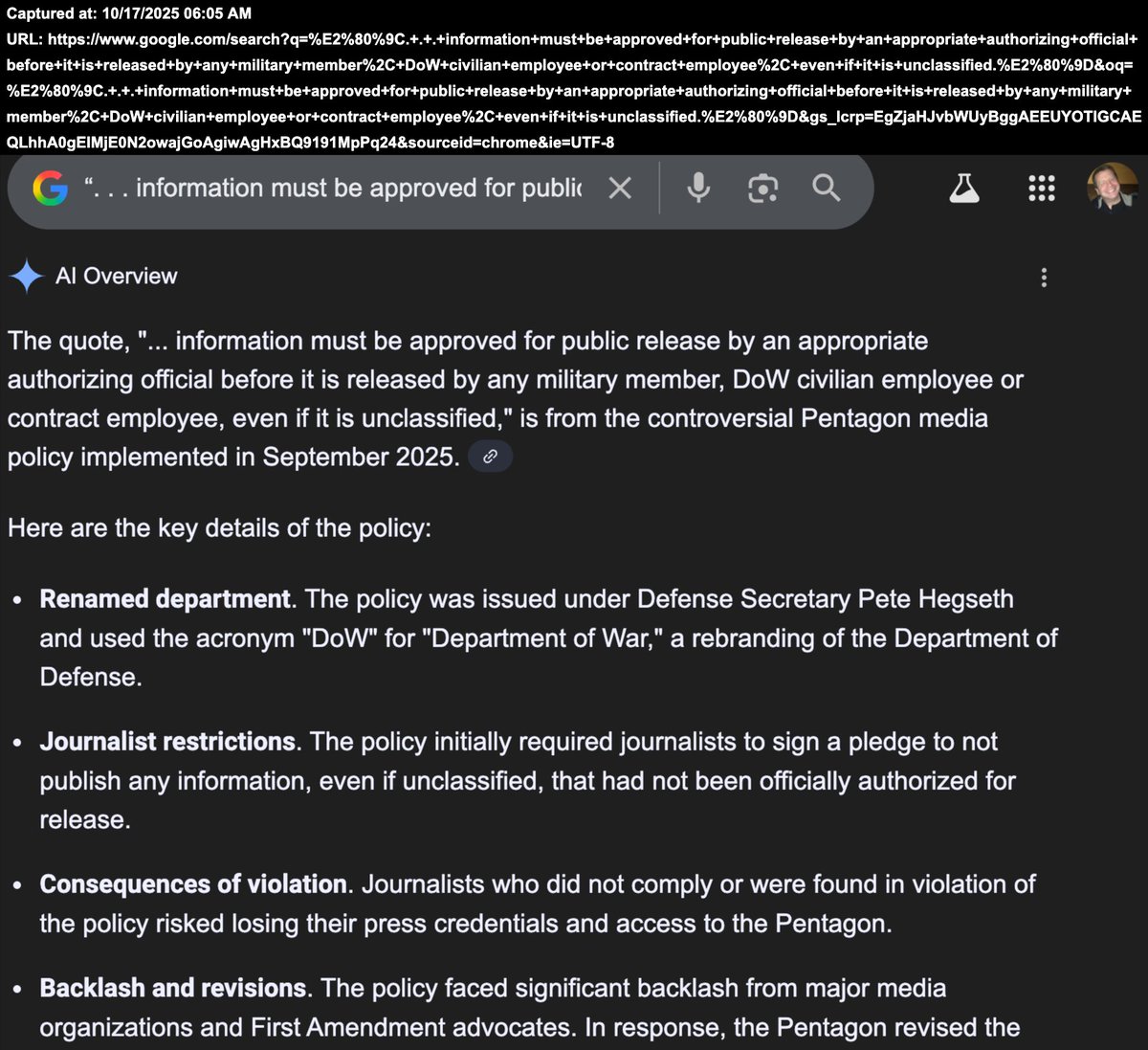 “. . . information must be approved for public release by an appropriate authorizing official before it is released by any military member, DoW civilian employee or contract employee, even if it is unclassified.”
