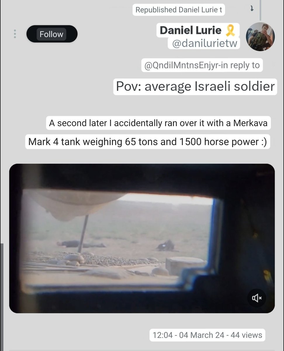 🧵Israeli soldier/reservist Daniel Lurie, 22yo according to his bio, tweeted a short video featuring a dead body of a Palestinian seen through a tank's window and wrote: "A second later I accidentally ran over him with a Merkava Mark 4 tank weighing 65 tons, 1500 horse power :) "