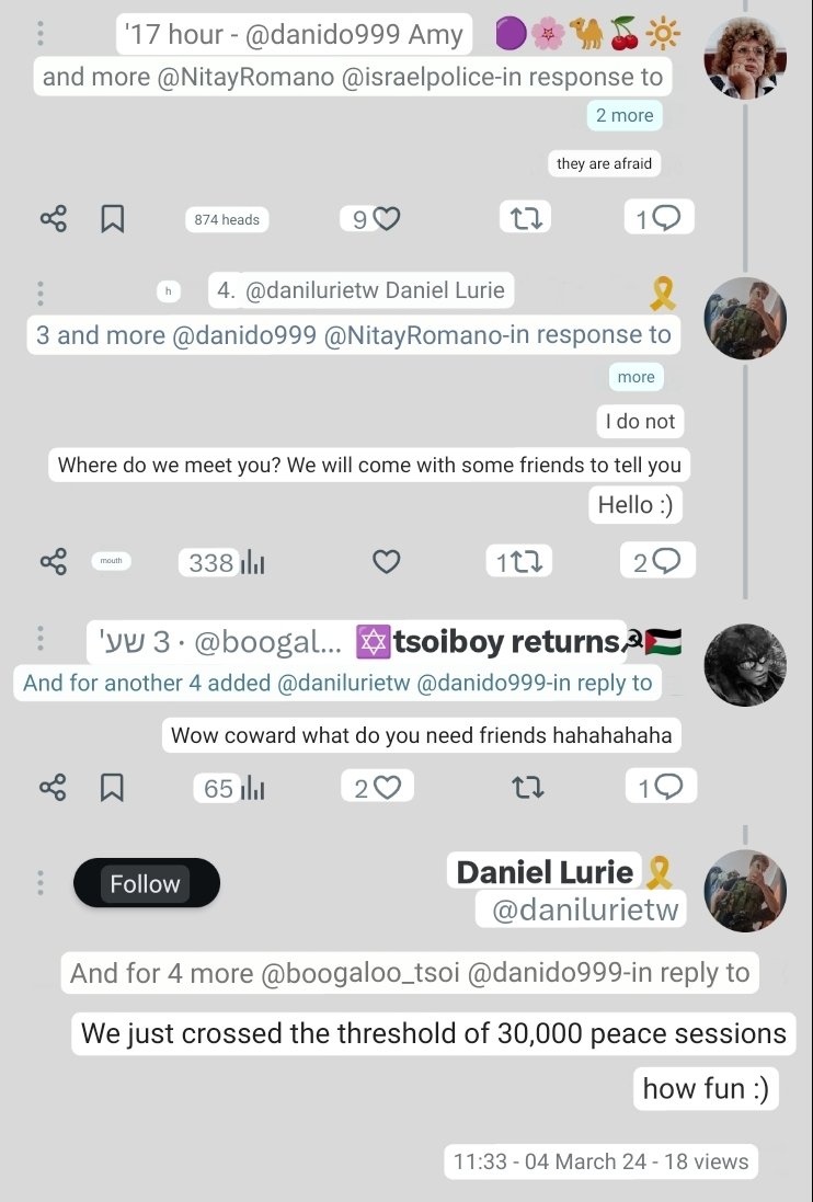 The above tweet was part of a sub-thread where he threatened an Israeli girl who posted a photo of herself with a Palestine flag. He threatened to come with friends to "tell her hello".