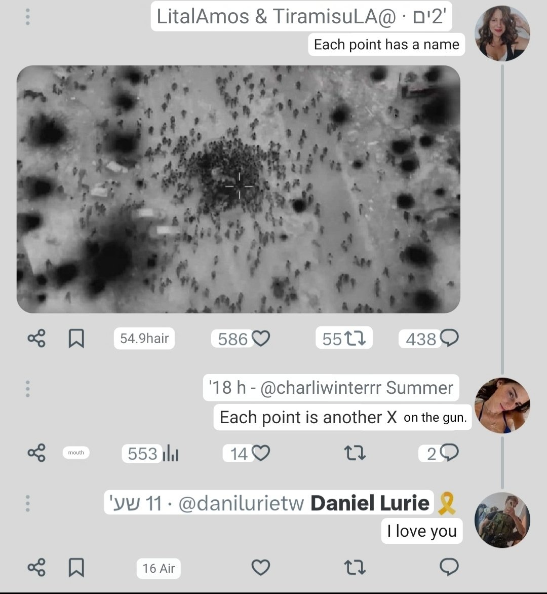 Another Twitter user, seemingly also an Israeli soldier, wrote in response to a still from the IDF's "Flour Massacre" drone footage "Each dot is another X on the gun". Lurie showed his support by commenting "I love you".