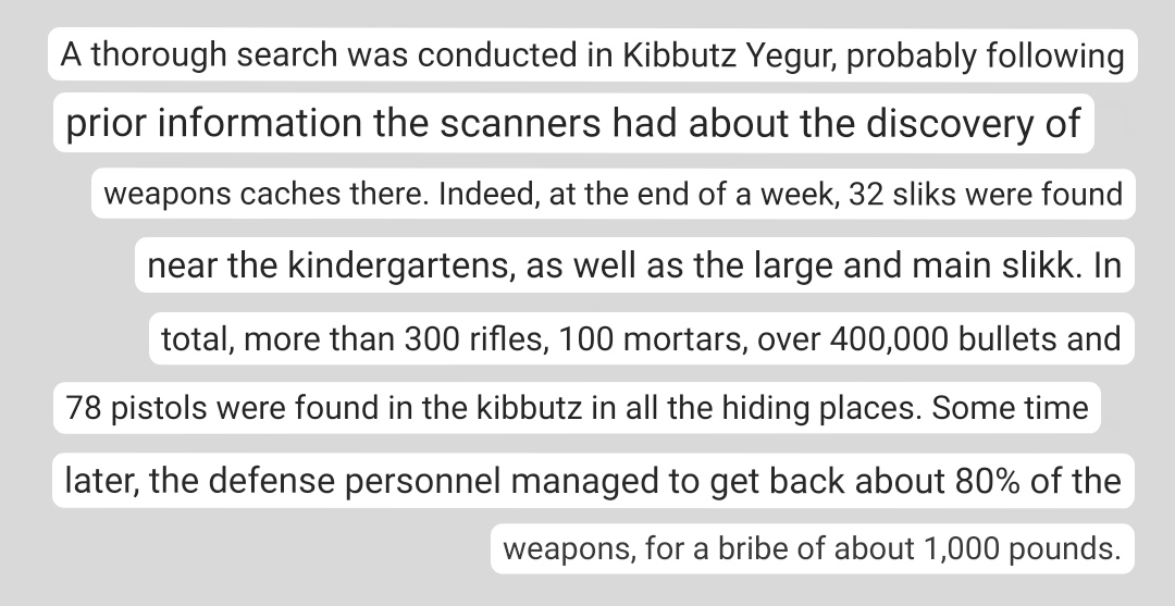 In Yagur, for example, weapons caches were found "in every corner of the Kibbutz", including the kindergartens.