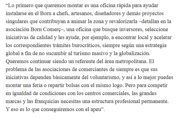 6.- Esto es precisamente lo que señalan los representantes del Born en la noticia de La Vanguardia cuando comentan que lo que persiguen es "ayudar instalarse en el Born a chefs, artesanos, diseñadores y demás proyectos singulares que contribuyan a animar la zona y revalorizarla".