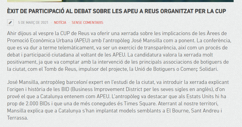 1.- Para el que no las conozca, las APEU son Àrees de Promoció Econòmica Urbana. Se trata de una organización de carácter privado, pero con supervisión pública, que une a una mayoría de comerciantes de una determinada zona de la ciudad.