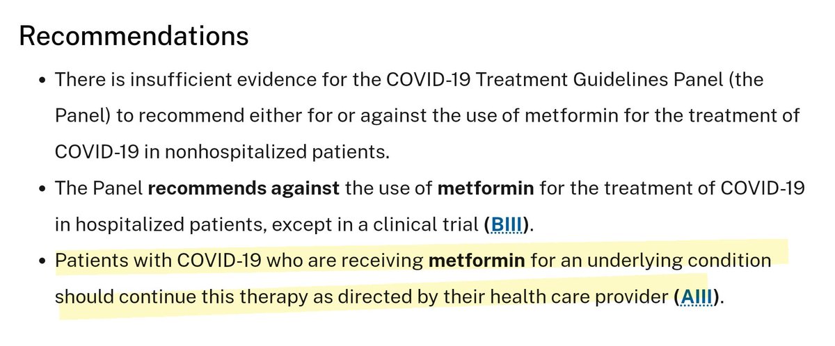 And if you're already on Metformin for diabetes or otherwise, it should be continued during acute infection, even if you're hospitalized. (Expert opinion via NIH guidelines, which will be sunsetted in August, so download them if you need them). covid19treatmentguidelines.nih.gov/therapies/misc…