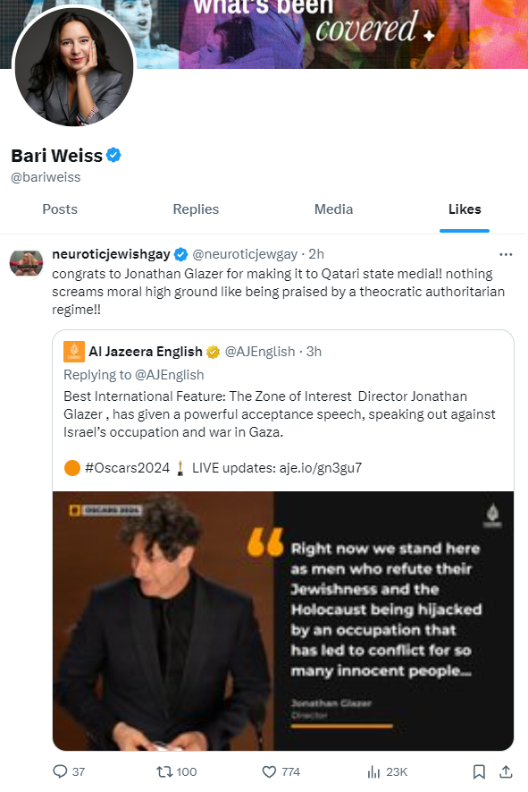 all the deranged genocidal Zionist maniacs are so infuriated that Jonathan Glazer stood in front of the world and dared speak up for the basic humanity of Palestinians as he identified the occupation as the root of the Israeli regime's evil. Also Bari Weiss killed Refaat Alareer