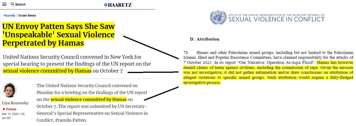 as I detailed in the thread below, Patten's UN report had no investigatory mandate, relied entirely on Israeli propaganda sources as they continue to block an actual UN investigation, and it debunks the "mass rape" hoax as fabricated by the New York Times: