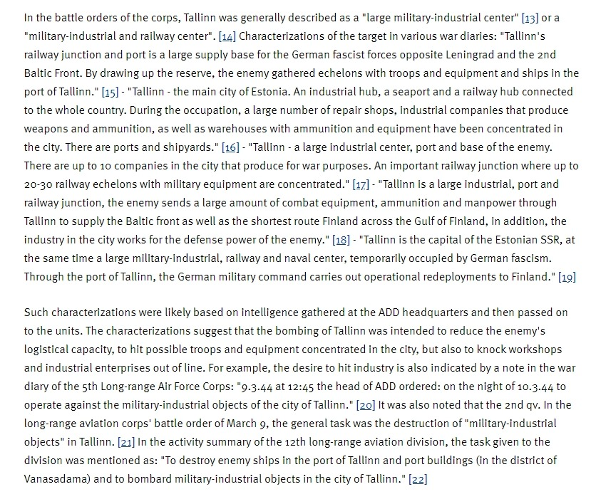 Da ciò che sappiamo, Tallinn fu triste esempio di obiettivo militare - nerbo logistico tedesco - colpito senza riguardo per le perdite civili collaterali: emerge dagli ordini per i piloti sovietici.