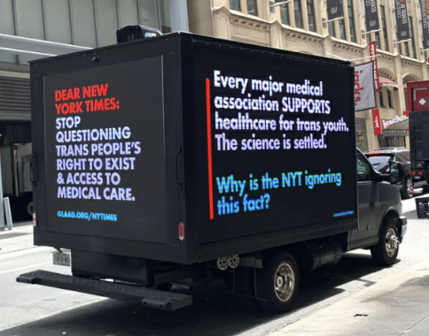 The LGBTQ advocacy group @GLAAD marked the anniversary of driving a truck around the @NYTimes building to protest the Times' trans coverage by doing it once more today. GLAAD has inaccurately claimed that the "science is settled" regarding pediatric gender-transition treatment.