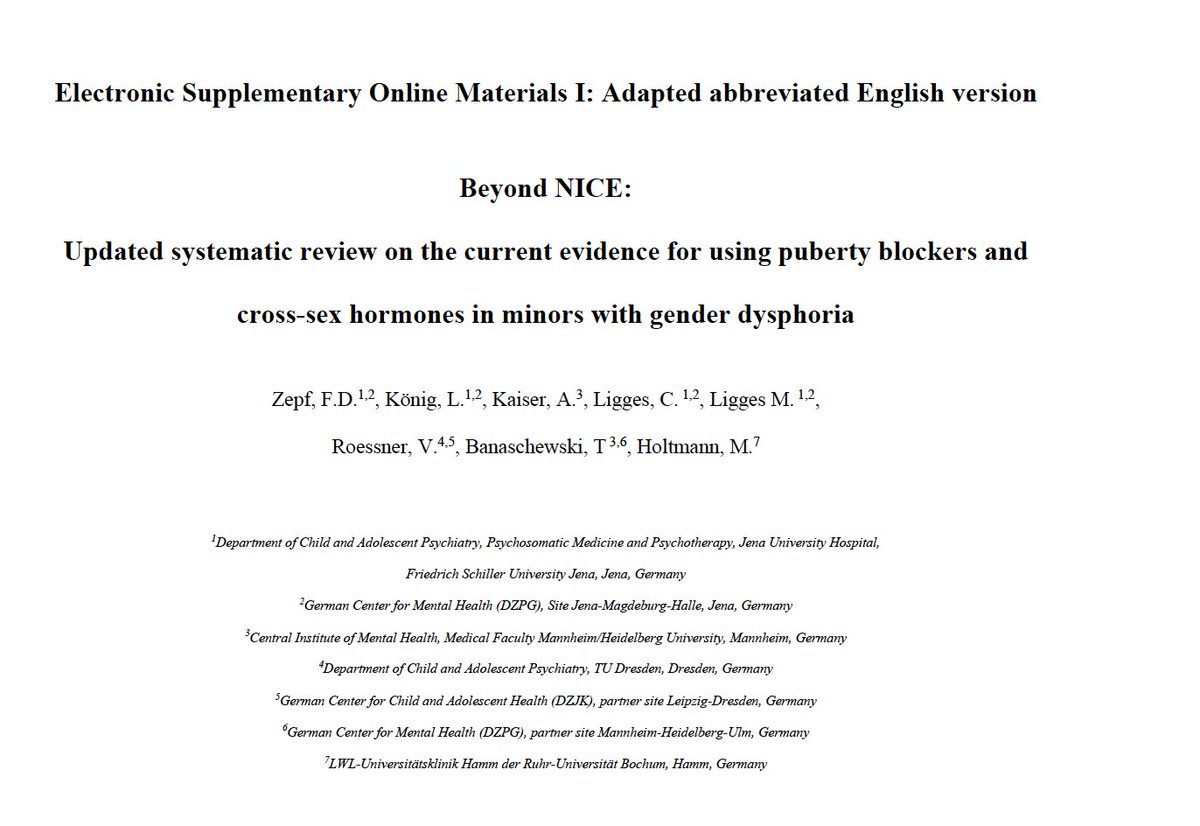 A new systematic literature review, by Germans, of puberty blockers (PB) and cross-sex hormones (CSH) to treat gender dysphoria (GD) in kids concludes: "Current evidence does not clearly suggest that GD symptoms and mental health significantly improve when PB or CSH are given to minors with GD." econtent.hogrefe.com/doi/10.1024/14…