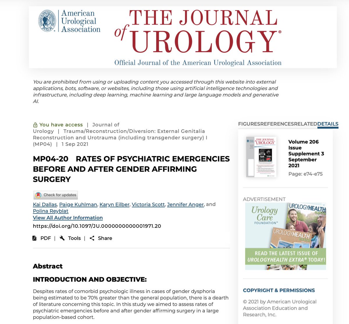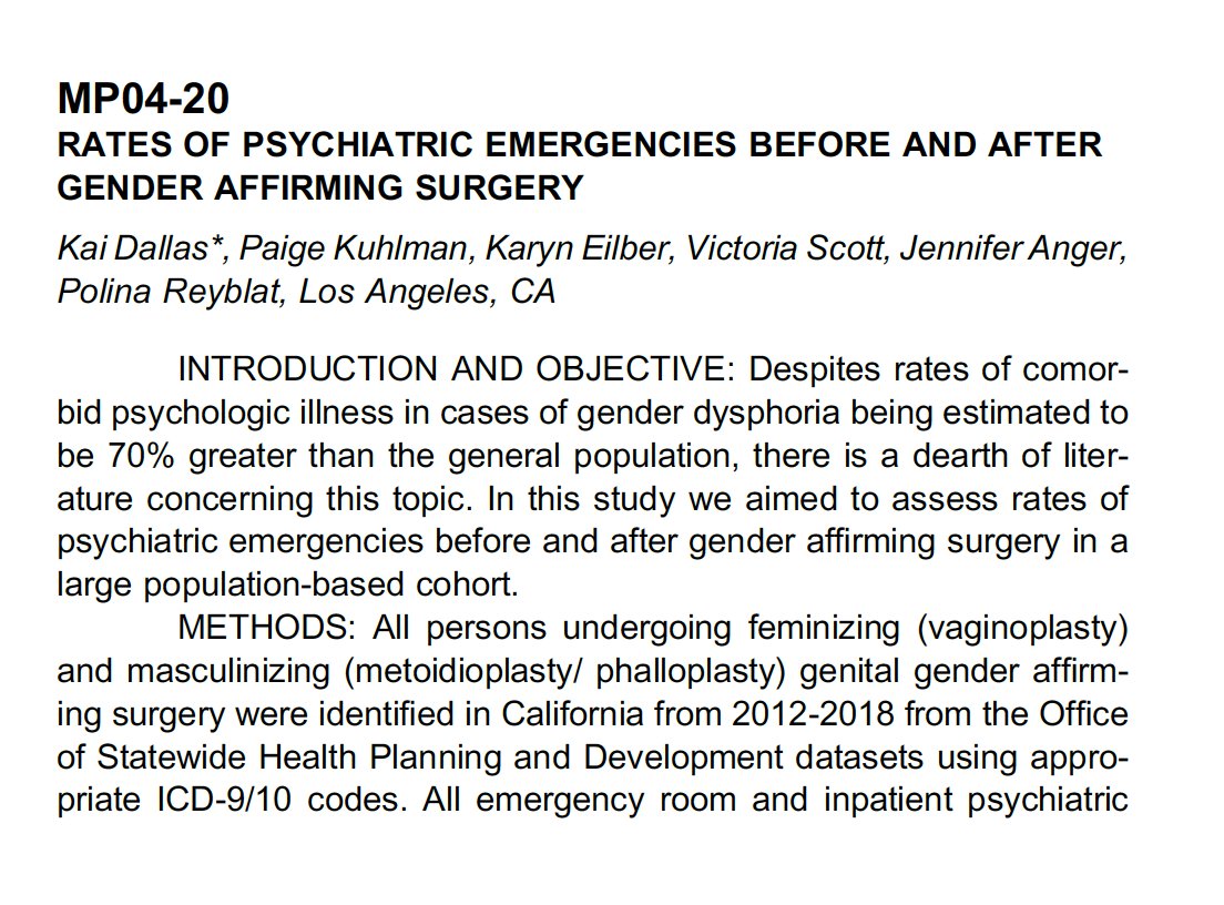 "Patients undergoing [gender-affirming surgery] with a history of prior psychiatric emergences or feminizing transition are at higher risk and should be counseled appropriately," the study authors concluded. auajournals.org/doi/10.1097/JU…