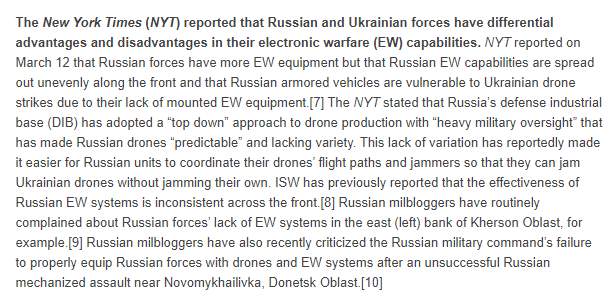 2/ NYT reported on March 12 that Russian forces have more EW equipment but that Russian EW capabilities are spread out unevenly along the front and that Russian armored vehicles are vulnerable to Ukrainian drone strikes due to their lack of mounted EW equipment.