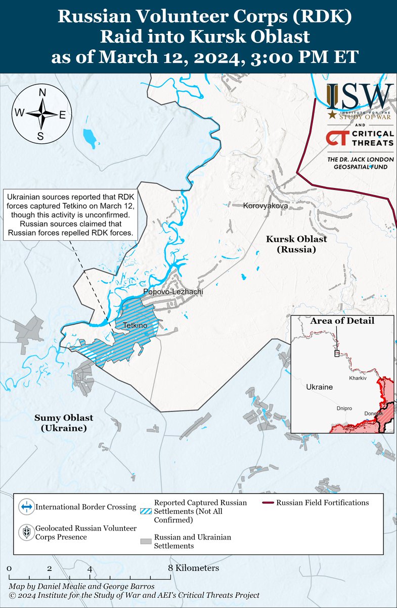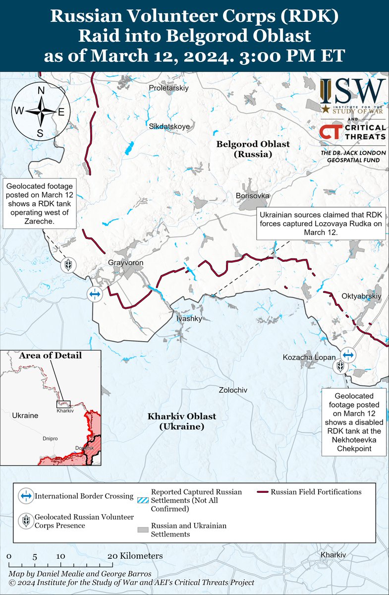 3/ Russian sources initially denied reports of the incursion but later claimed that Russian forces repelled Russian pro-Ukrainian forces with tank, armored vehicle, and drone support attacking near Odnorobivka, Kharkiv Oblast, and Nekhoteevka and Spodaryushino, Belgorod Oblast.
