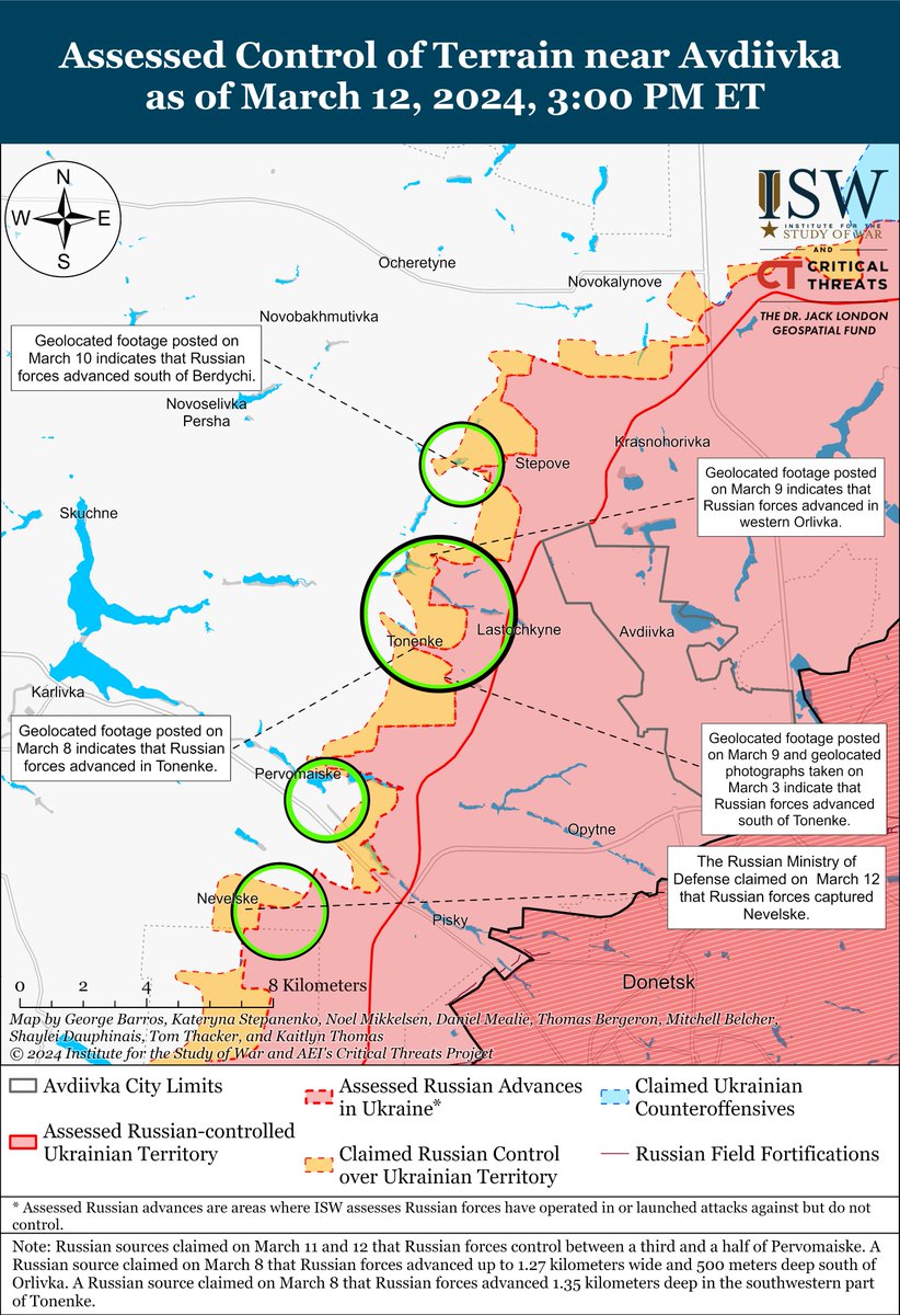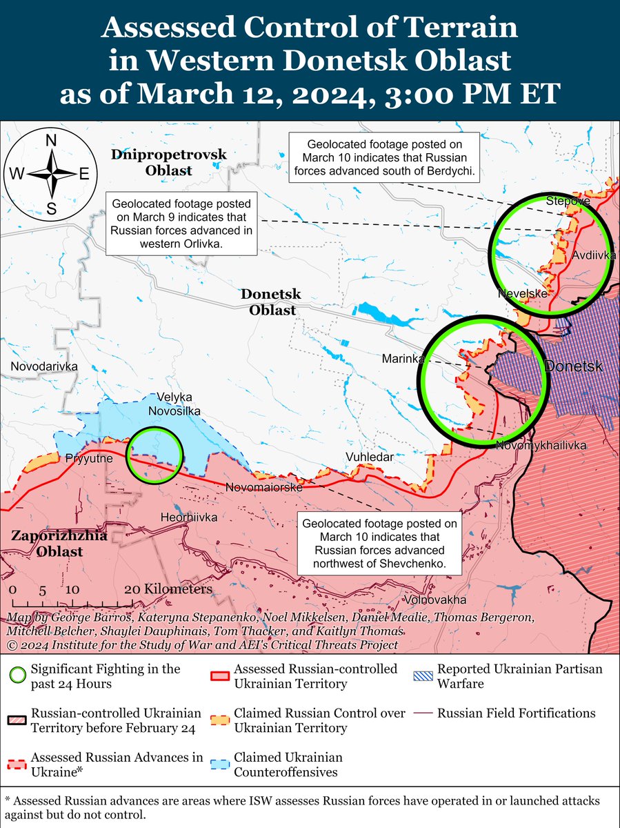 Russian forces recently made confirmed advances near Bakhmut, Avdiivka, and Donetsk City amid continued positional engagements along the entire line of contact on March 12. 🧵(1/7)