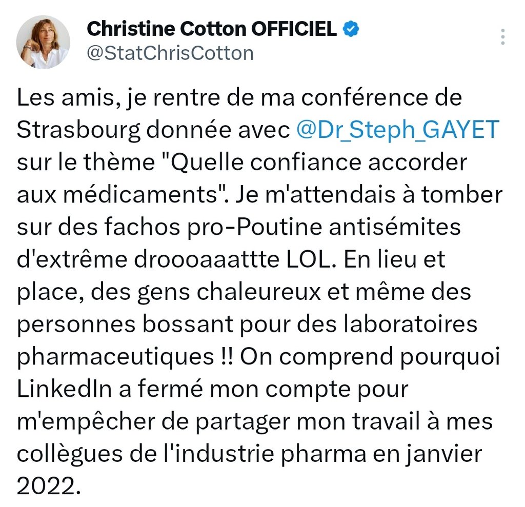 Suite à cette sauterie, les fachos feront une conf de presse. L'occasion pour Hélène Banoun une très proche de Réinfocovid, de sortir une nouvelle clownerie en affirmant qu'une «scientifique de l'Agence Européenne du Médicament reconnaît l'existence de lo [du vaccin] toxiques»