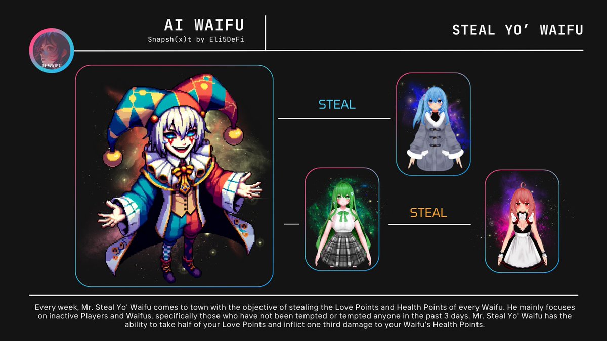 → To add more exciting mechanics, every week, Mr. Steal Yo' Waifu comes to town with the objective of stealing the Love Points and Health Points of every @aiwaifugg.
