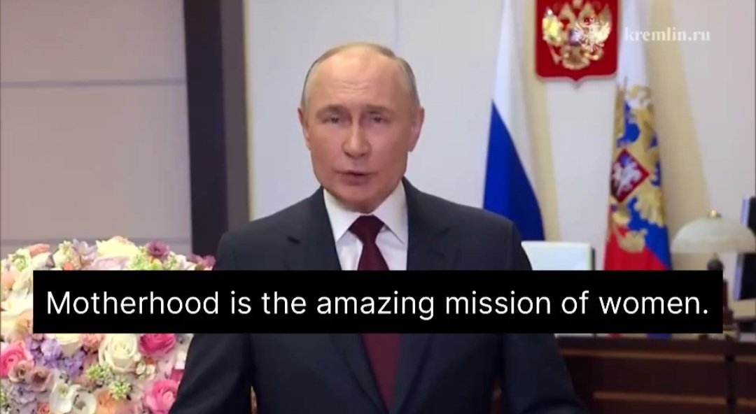 #Putin hielt eine kurze Grußbotschaft zum #Weltfrauentag. Er hob darin die vermeintlichen "traditionellen Werte" in #Russland hervor. Frauen haben darin in allererster Linie die Aufgabe für Nachwuchs zu sorgen, um die anhaltende demographische Krise zu lösen. Gewalt gegen Frauen/
