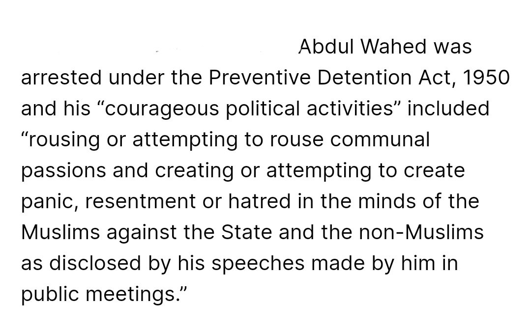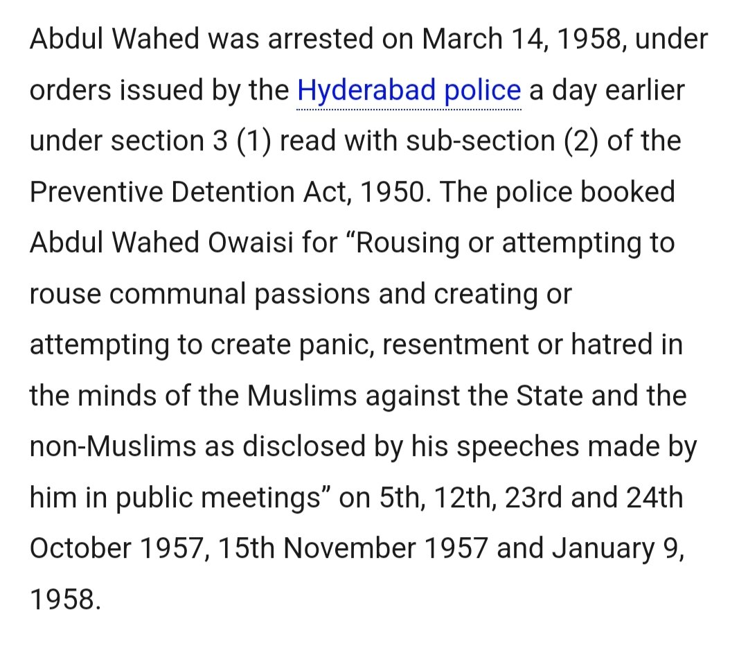 In March 1958, Maulvi Owaisi Arrested under the Preventive Detention Act, 1950 l& anded in Chanchal Guda Jail for 11 months for inciting Muslims to rise against Hindus.