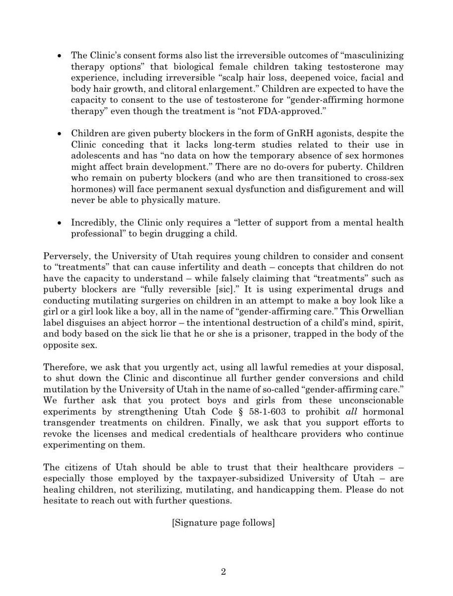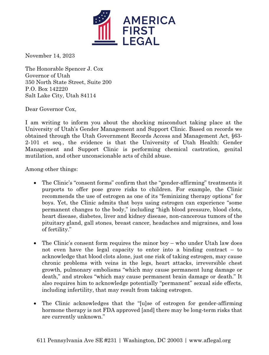 /10 Following these disturbing findings, AFL President @StephenM swiftly sent a formal request to the Utah Governor asking him to immediately disband this Utah gender clinic that experiments on children.
