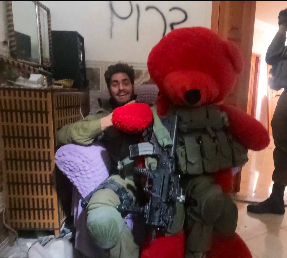 2/8 Seen quite a few of these already: Israeli soldiers with displaced/murdered children's teddy bears. I bet that if the child is still alive he'd have loved to have his teddy bear to hug at night. Instead, a psychopath soldier uses it for his amusement and a few likes on social