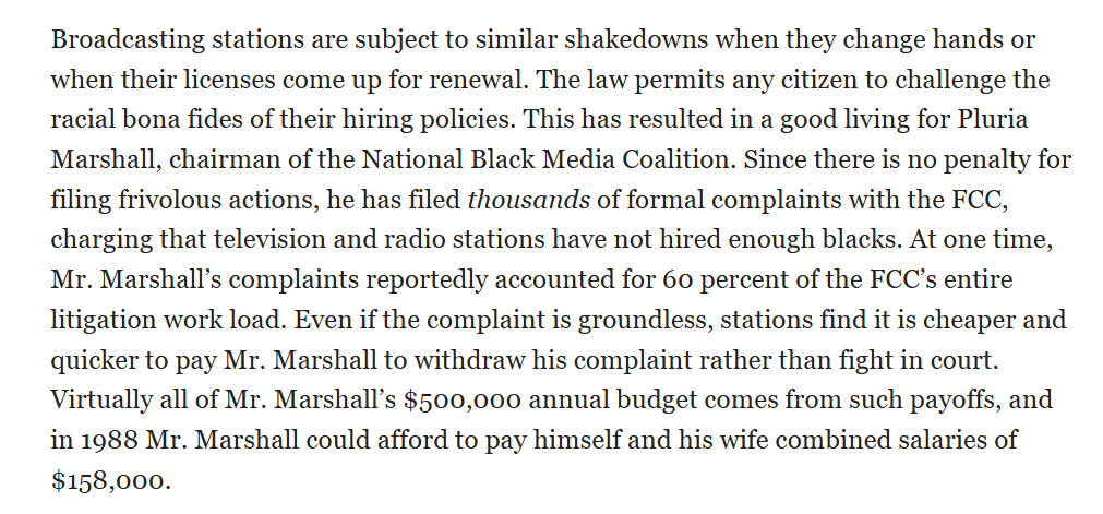 When broadcasting licenses change, citizens can challenge the racial bona fides of their hiring policy, allowing black activists to extort money and jobs through threat of lawsuit.