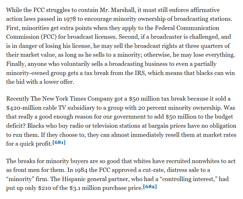 There are tax breaks for selling broadcasting stations to nonwhites, in the tens of millions of dollars.