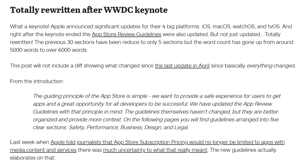 In June 2016, Apple completely reorganized their App Store Review Guidelines into five pillars: Safety, Performance, Business, Design, and Legal.