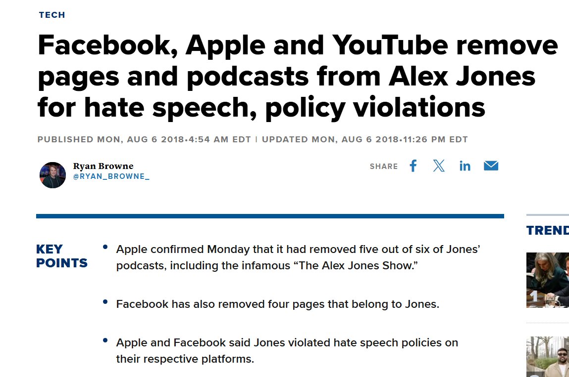 Most of Apple's big decisions were not policy ones but specific removals that had a chilling effect on future discourse. In Aug 2018, Apple removed 5/6 Alex Jones podcasts for hate speech. This was done jointly with similar actions from Facebook, YouTube, and Spotify.