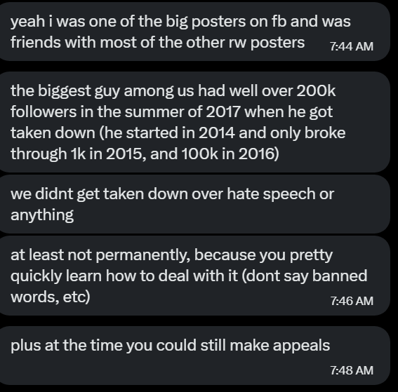 An admin for one of the biggest right-wing Facebook groups DM'd me with his impressions/experience with Facebook moderation and censorship (and gave me permission to post this thread). RW Facebook was big in 2016/17.