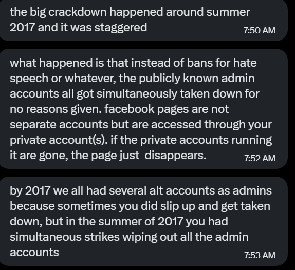The big crackdown began in summer 2017; it did not take the form of bans for hate speech but rather all publicly-known admin accounts getting suspended for no reason, leading to the pages disappearing.