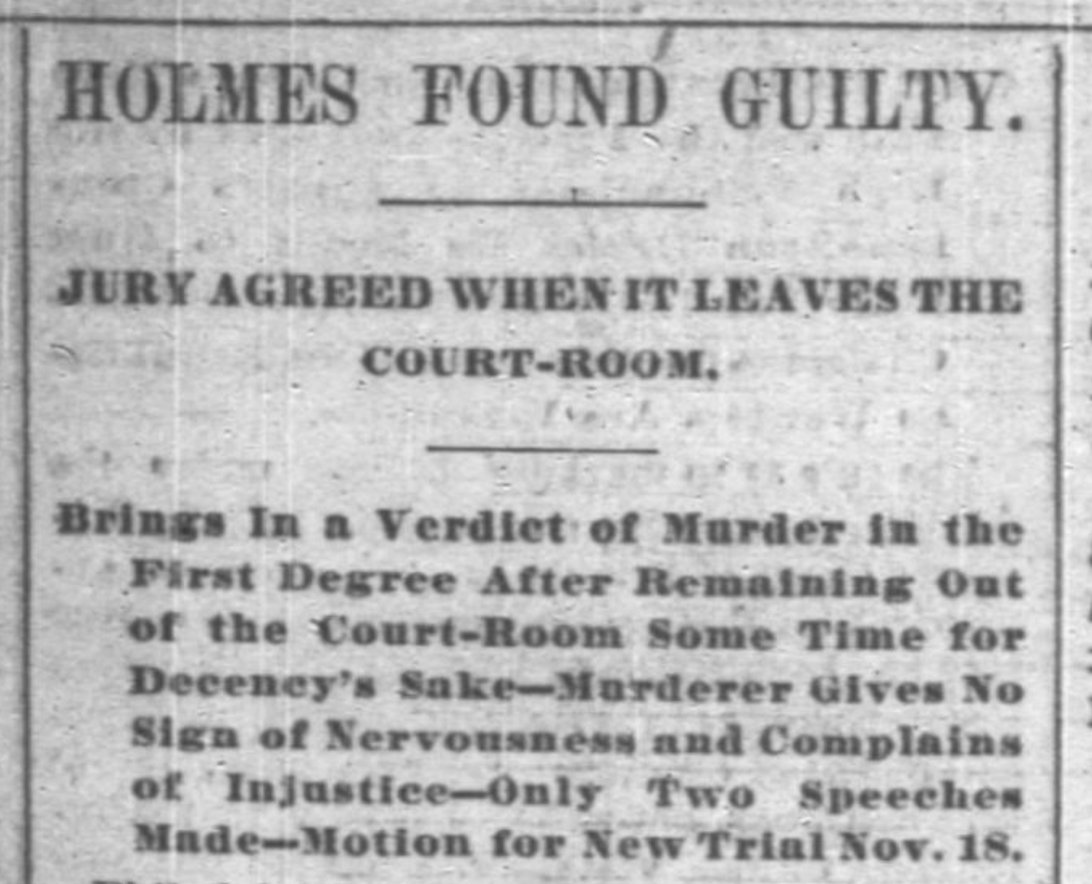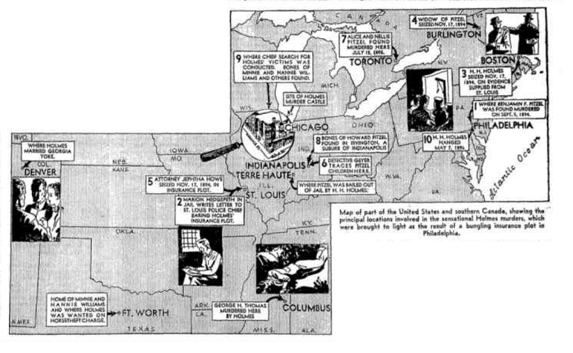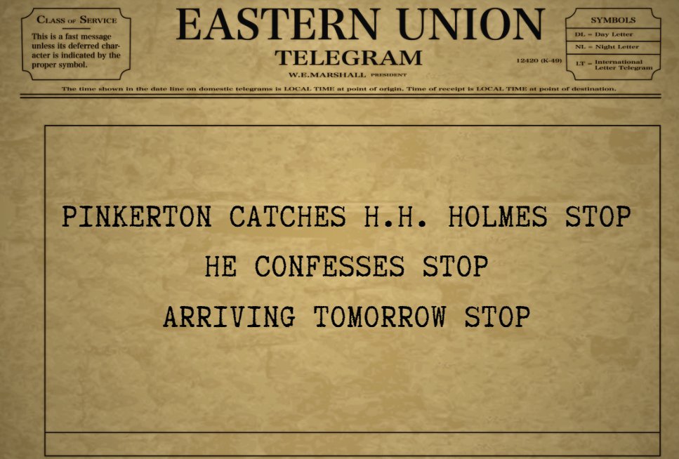 Por otro lado, a Holmes le condenan solo por el asesinato de Ben Pitezel, pero después confiesa a la policía otros 27 crímenes y llega a confesar 200 a los medios. La policía solo verifica 9 asesinatos pero tampoco es capaz de verificar el paradero de otras 14 personas.